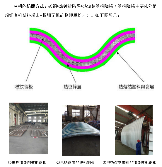 2010年,針對各地公路用熱鍍鋅波紋鋼管涵洞的腐蝕條件和行業(yè)防腐要求, 我公司與中國防腐蝕協(xié)會及南京工業(yè)大學、南京工程學院、中國石化集團金陵石化公司等單位合作研究,借鑒及創(chuàng)新了其它領域的高壽命的成熟防腐技術,將有機材料與無機超硬質礦物材料融合,成功的取得了埋地用鋼結構的熱浸鍍鋅加熱熔結塑料陶瓷的綜合防腐技術,并已在國內(nèi)高速公路埋地式鋼質波紋管涵洞結構中運用,效果顯著,獲得行業(yè)好評。2017 年,該項技術獲得南京市人民政府頒發(fā)的科技進步二等獎。