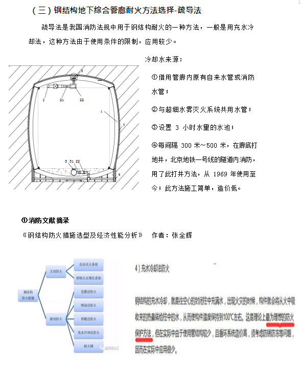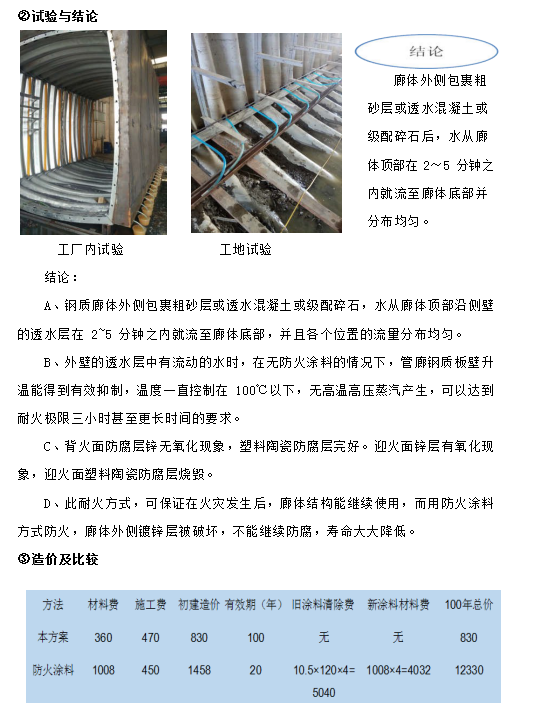 ⑨ 應(yīng)對耐火極限三小時的方式是涂耐火涂料,但耐火涂料壽命只有 10~20 年, 并且不能長期耐潮,在壽命到期失效后重新涂刷時,由于內(nèi)部管線及設(shè)施的存在, 清除殘余失效涂層的工作量大,涂刷新涂層更繁雜,費(fèi)用較初次施工時大大增加, 并且在管廊整個壽命周期內(nèi)要多次更換防火涂層;更為重要的是,耐火涂料只能阻止火災(zāi)時鋼結(jié)構(gòu)的溫度不高于 550℃,但對于鋼結(jié)構(gòu)地下管廊來說情況特殊,在火災(zāi)發(fā)生半小時左右,耐火涂料覆蓋的鋼結(jié)構(gòu)體溫度就超過 150℃,廊體外部土壤中的水份形成高溫高壓蒸汽,其產(chǎn)生的次生災(zāi)害有可能嚴(yán)重于火災(zāi)本身。